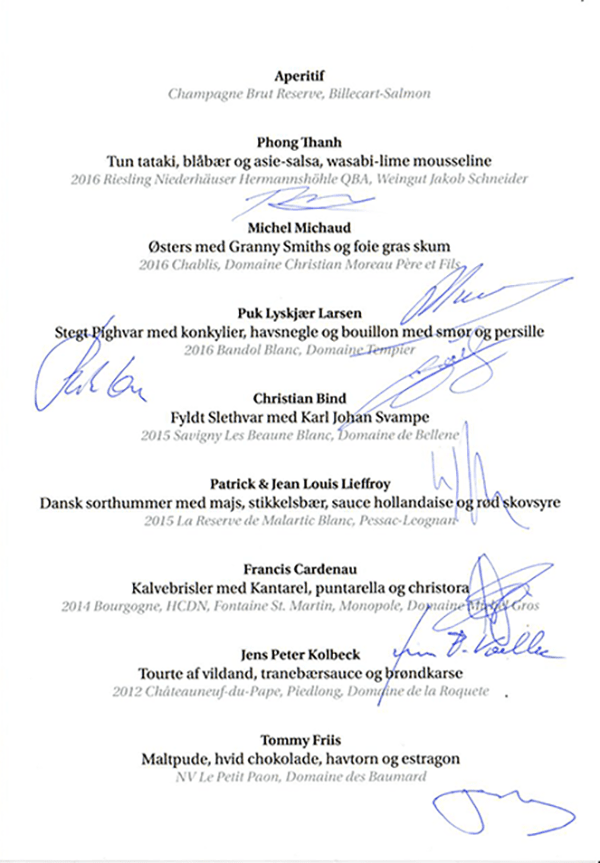 Tak til chefkokkene Jens-Peter Kolbeck, Jean-Louis, Patrick Lieffroy, Christian Bind, Puk Lyskjær Larsen, Francis Cardenau, Michel Michaud, Tommy Friis, Phong Thanh, deres dygtige medhjælpere og tjenere for nogle dynamiske, inspirerende og smagfulde timer.