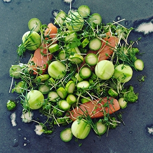 Anret laksen med asparges, agurk. Karse og dild og dryp lidt pesto rundt på tallerkenen.