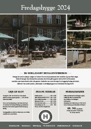 Nedenfor ser I vores oplæg til bryllupspakker med idéer til. hvordan Jeres bryllupsfest kan sammensættes. Hos os har I har mulighed for at holde jeres slotsbryllup på Fyn med overnatning over en hel weekend, så I kan nyde hinanden, jeres gæster og de fynske attraktioner.