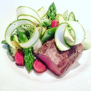 Rådyrfilet er utroligt fint, saftigt og mørt, ja næsten noget af det bedste kød man kan få. Vi serverer det som udgangspunkt rosastegt, både for smagens skyld men også fordi det bliver mest saftigt. Vi har valgt at lave en forholdsvis lys sauce til, for at fremhæve den fine smag i kødet og hvad er mere naturligt end at servere sommerbukken med grønne asparges, rabarber og nye kartofler. Naturen fra sin bedste side lige nu.